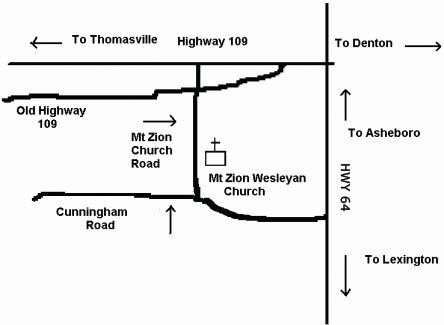 Mt Zion Wesleyan Church is located at 222 Mt. Zion Church Rd in Thomasville between HWY 109 and Cunningham Rd as well as off of HWY 64.